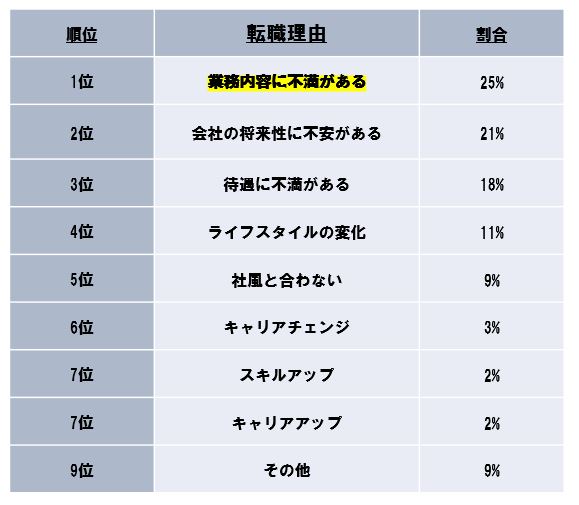 「業務内容に不満がある」が25%で1位。「会社の将来性に不安がある」が21%で2位。「待遇に不満がある」が18%で3位という結果になりました。