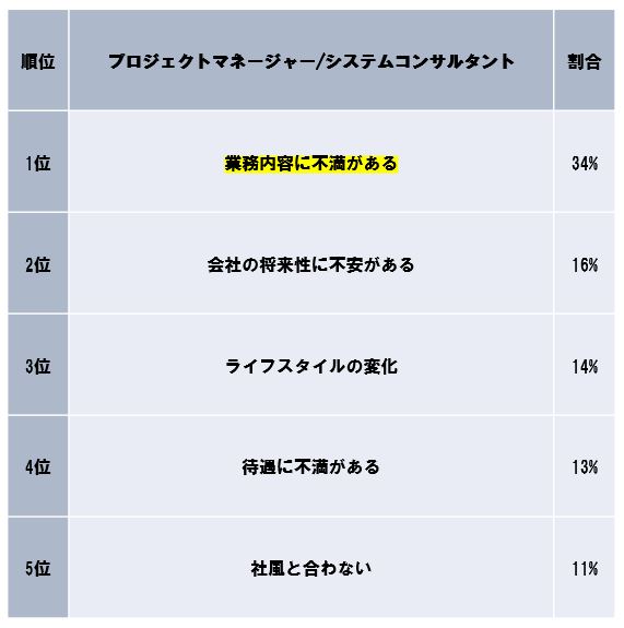また、プロジェクトマネージャーやシステムコンサルタント職など上流職種の方の転職理由は下記の結果となりました。
