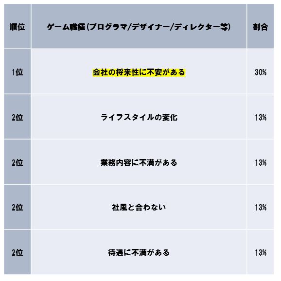 ゲーム職種では、「会社の将来性に不安ある」と回答した割合が30%と圧倒的に多くなっています。
