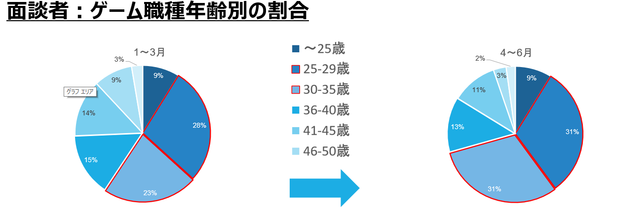 ゲーム職種の経験者を年齢別で区分したところ、直近3ヵ月比較で35歳以下の若手層が増加していました。