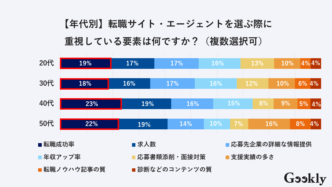 年代別で転職サイト・転職エージェントを選ぶ際に重視している要素について見ると、どの年代でも共通して「転職成功率」を重視していることが分かりました。