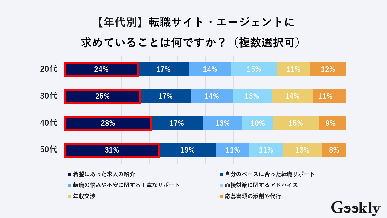 20代、30代の方は「応募書類添削・面接対策」といったサポートを求めており、転職経験の少ない方が多いためより選考に活用しやすい丁寧なサポートを重視している可能性があります。