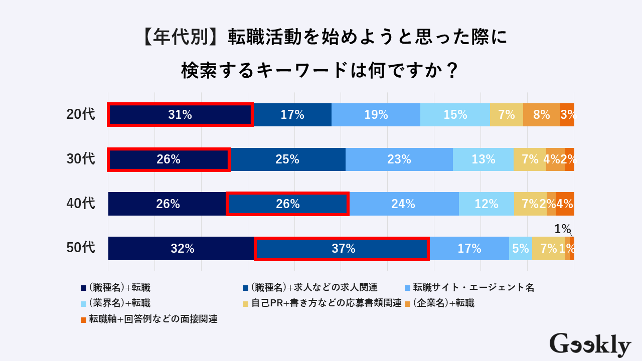転職活動を始める際に検索するキーワードでは、若年層は「職種名+転職」という回答が多く、熟年層は「職種名+求人」などの求人関連のキーワードが多い結果となりました。