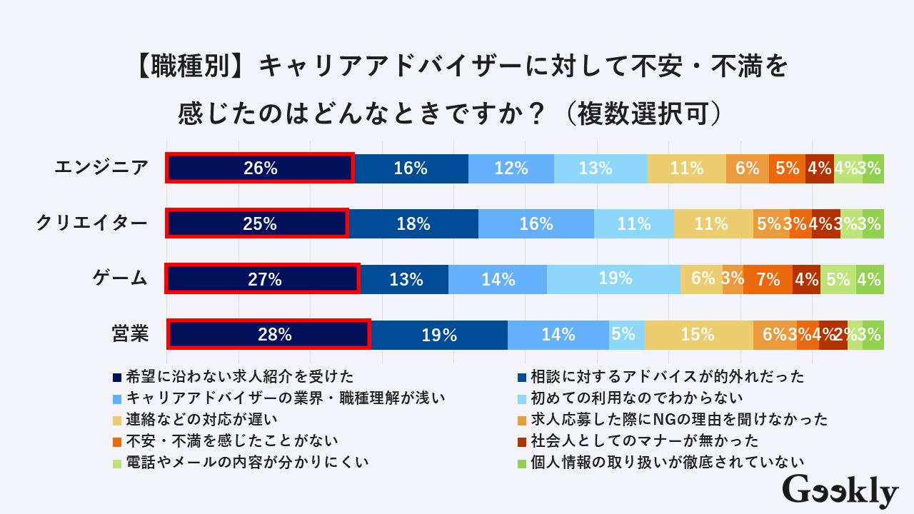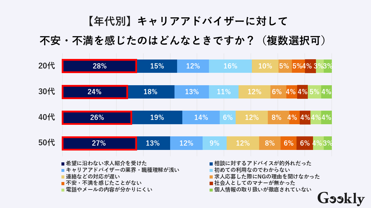 また、キャリアアドバイザーに不安・不満を感じたときについての質問では、全年代、職種を通して「希望に沿わない求人の紹介」という回答が最も多くなりました。