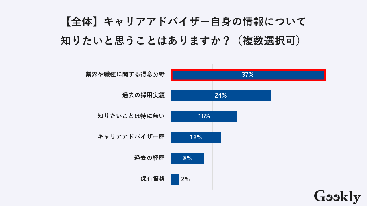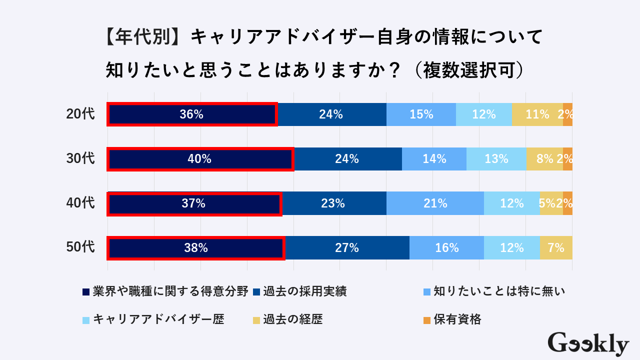 キャリアアドバイザー自身の情報について知りたいかという質問では、どの年代でも「業界や職種に関する得意分野」を知りたいという回答が最も多くなりました。