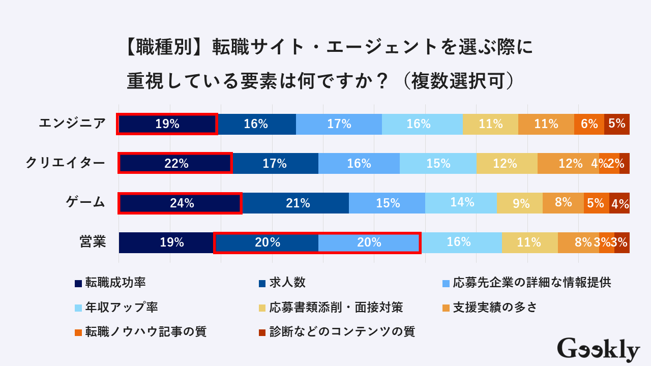 エンジニア、クリエイター、ゲームといったクリエイティブ職種は「転職成功率」を重視している方が多いのに対し、営業職は「求人数」や「応募先企業の詳細な情報提供」を重視している結果となりました。
