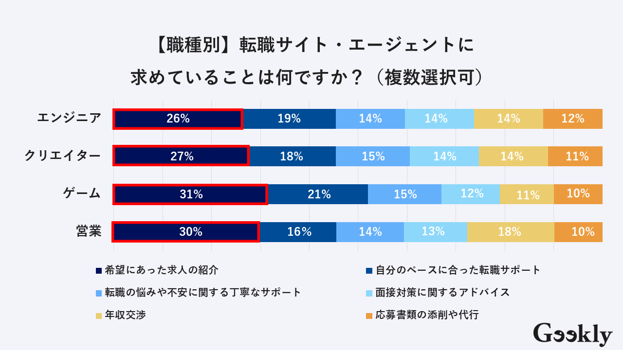 弊社ギークリーでは、24年9月にGeekly(ギークリー)のサービスをご利用いただいたエンジニア、クリエイター、ゲーム人材の方を対象に「転職サイト・エージェントを選ぶ基準や求めていること」についてアンケート調査を実施しました。転職サイト・エージェント選びにおいて重視していることやキャリアアドバイザーに対して不満に思ったことなども深掘りしていますので、ぜひご覧ください。