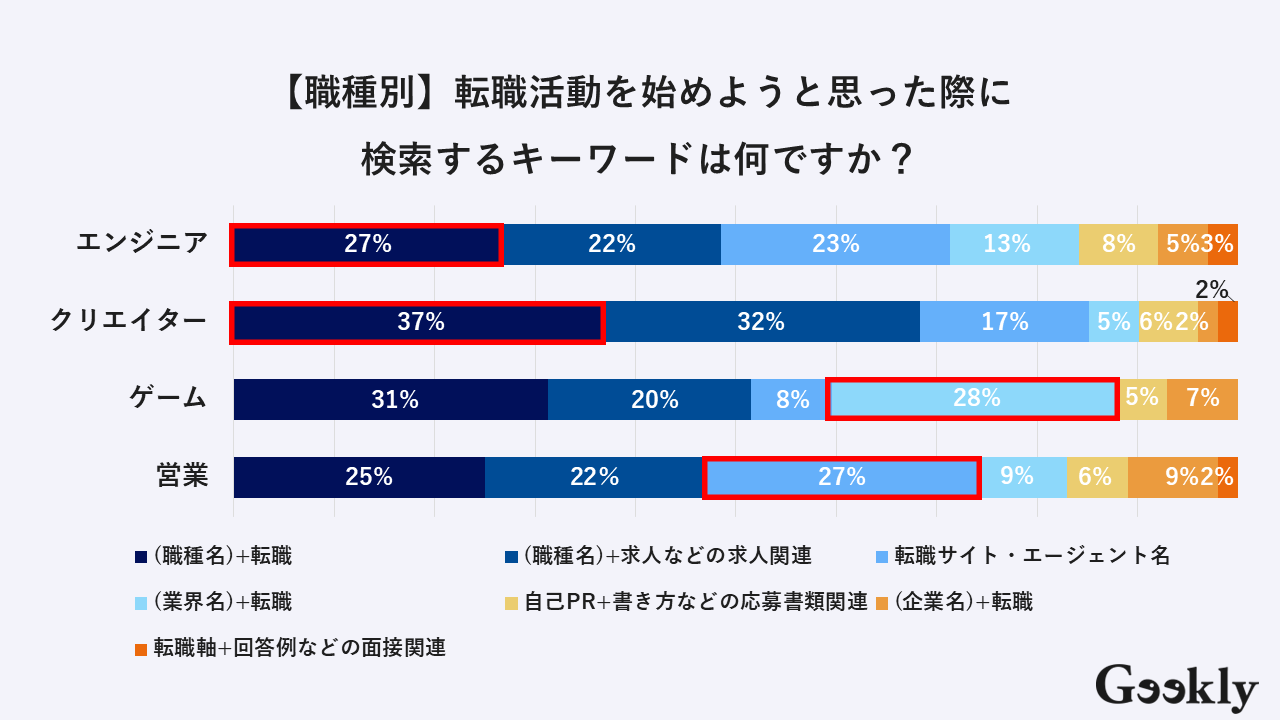 エンジニアやクリエイター職種の方は「職種名+転職」という回答が多く、営業職の方はゲーム職種とは対照的に「転職サイト・エージェント名」で検索することが分かりました。