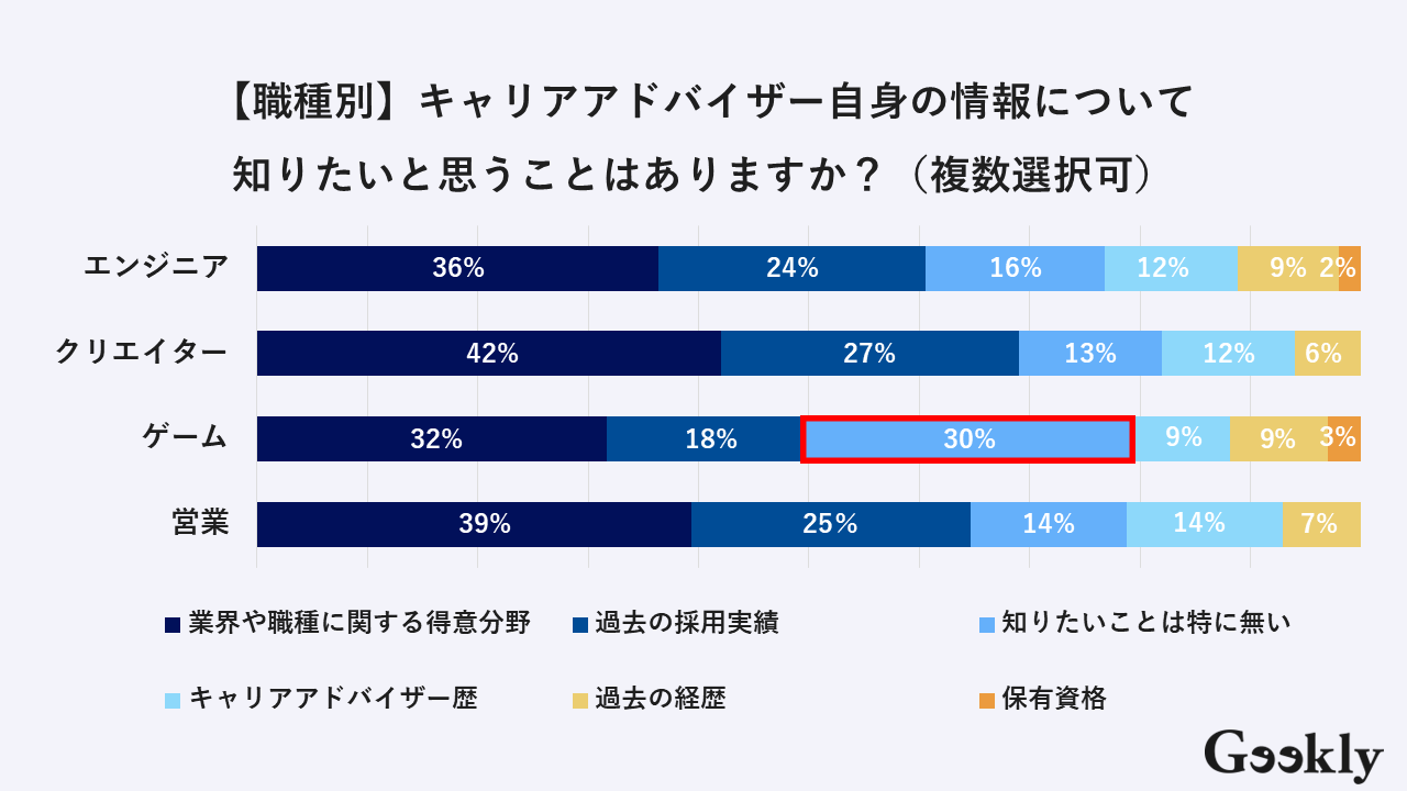 キャリアアドバイザー自身の情報について知りたいかという質問では、どの職種でも「業界や職種に関する得意分野」が知りたいという回答が多くなりましたが、ゲーム職種を見ると「知りたいことは特に無い」という回答も多くなりました。