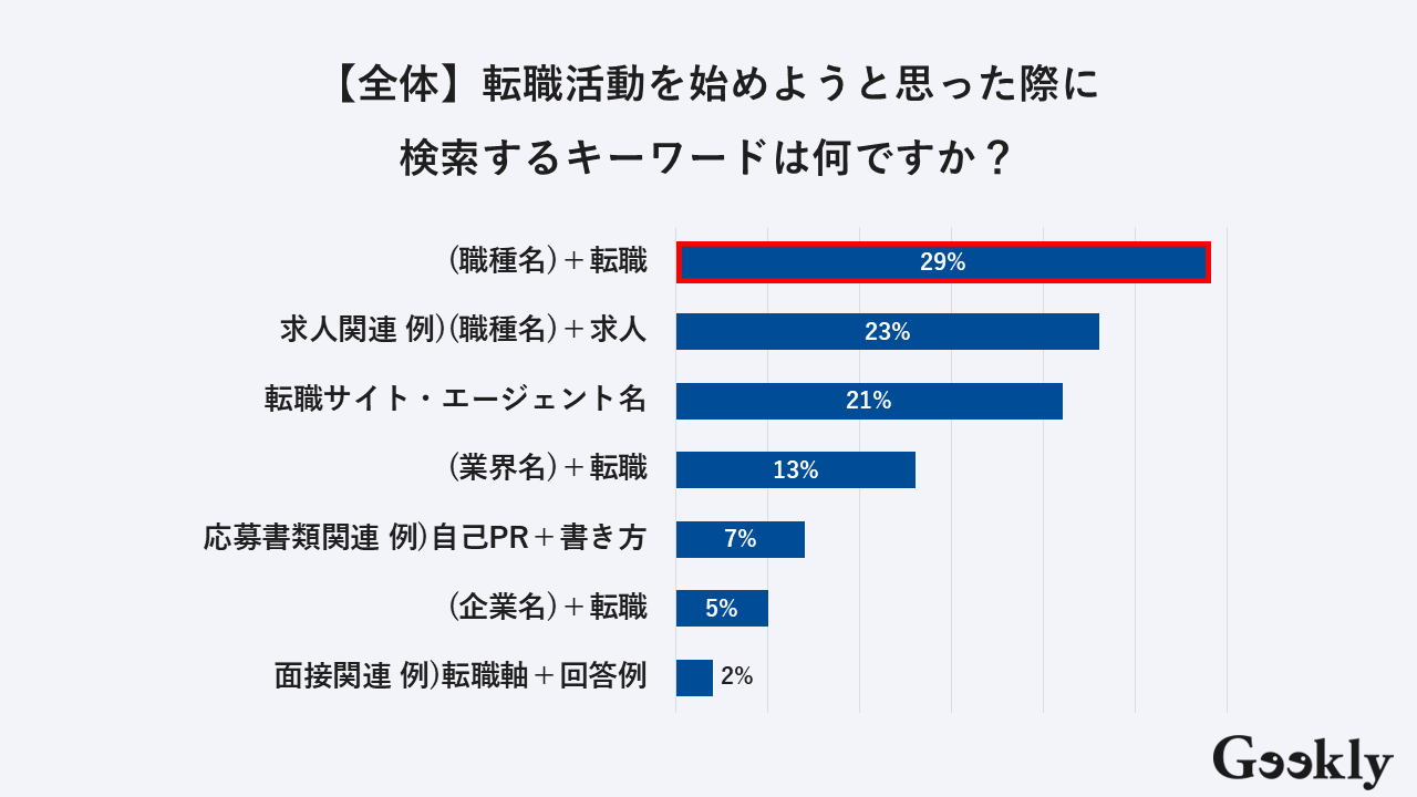 転職活動を始める際に検索するキーワードについての質問では、「職種目+転職」のキーワードが最も多い結果となりました。