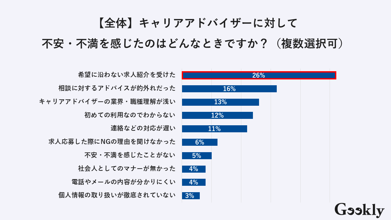 キャリアアドバイザーに対する不安・不満に関する質問では、年代別と同様に「希望に沿わない求人紹介を受けた」という回答が最も多い結果でした。
