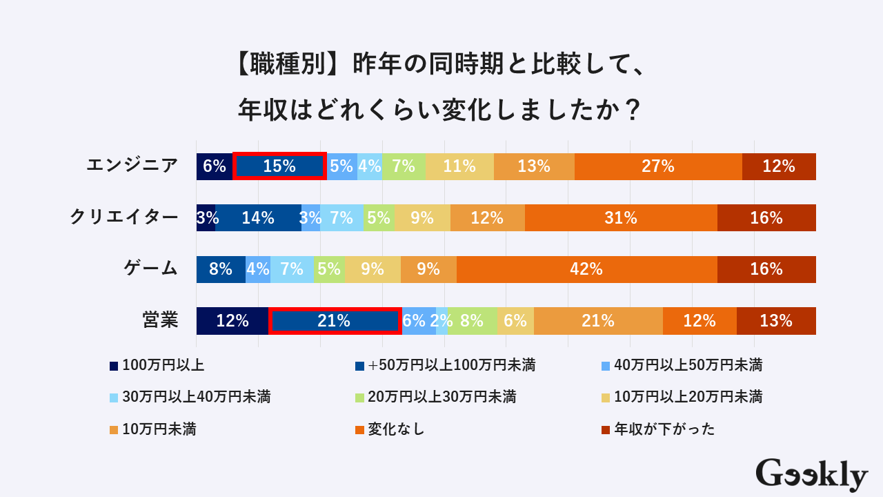 一見、専門的なスキルをもつエンジニアやクリエイター、ゲーム職種の方で年収が上がる傾向にあると思いますが、昨年に関しては営業職の方が年収が上がった傾向にあることが分かりました。