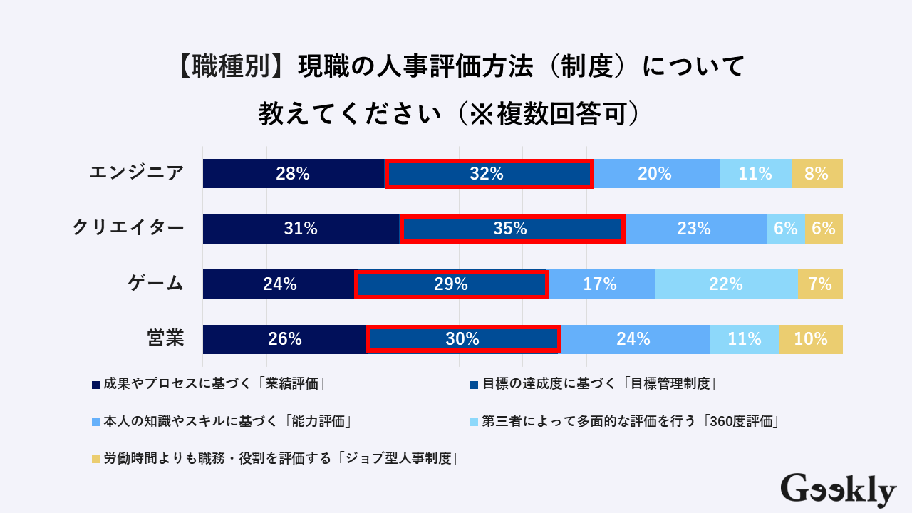 どの職種も「目標管理制度」の回答が多く、評価基準が不透明なことに不満を感じる