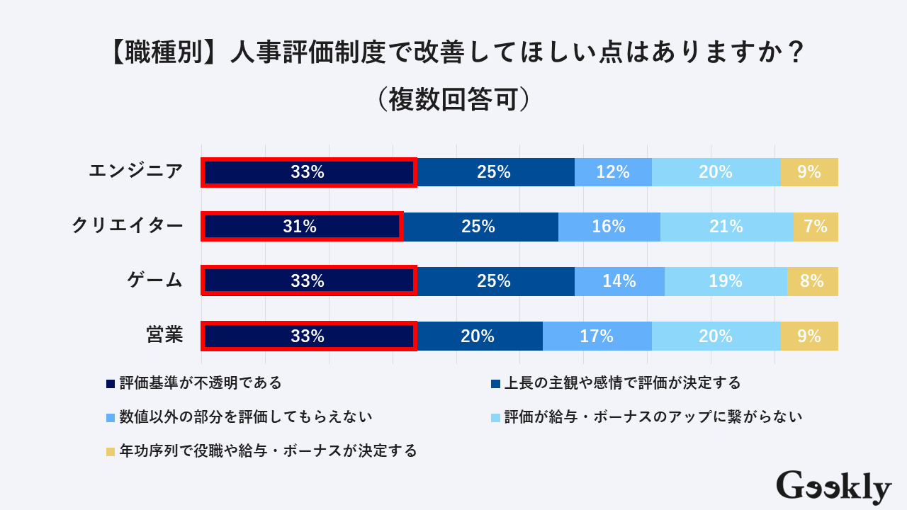 IT職種別に、現職の評価制度の不満についてしらべてみたところ、どの職種も「評価基準が不透明」と回答した方が多くなりました。
