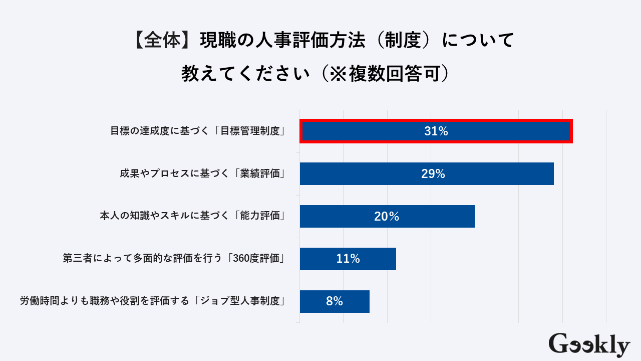 現職の人事評価方法について調査したところ、目標の達成度に基づく「目標管理制度」が31%と最も高く、次いで成果やプロセスに基づく「業績評価」が29%となりました。