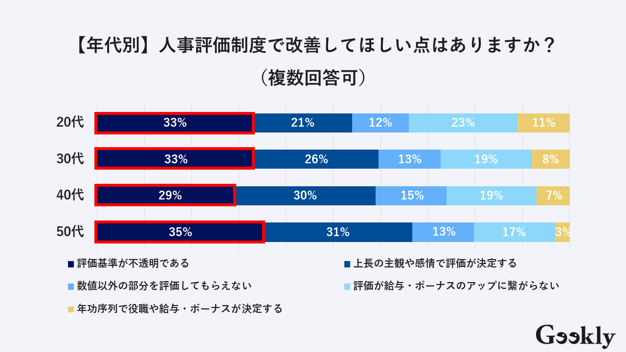 年代別で人事評価制度への改善点を調査した結果、ほとんどの年代で「評価基準が不透明である」といった回答になりました。