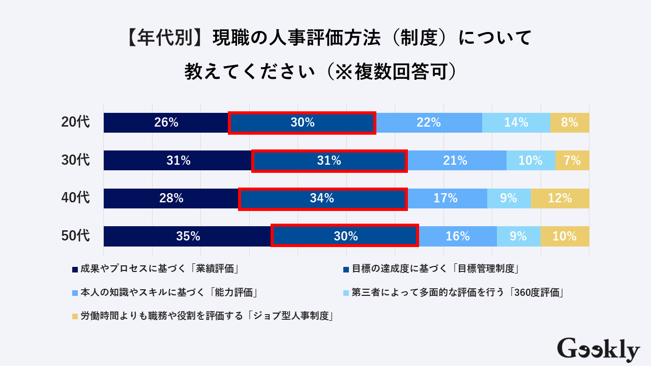 20代、30代、40代では「目標管理制度」が採用されており、最も高い割合となっています。しかし50代は僅差ではあるものの、「業績評価」の方が高い結果となりました。