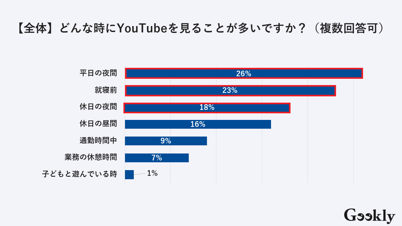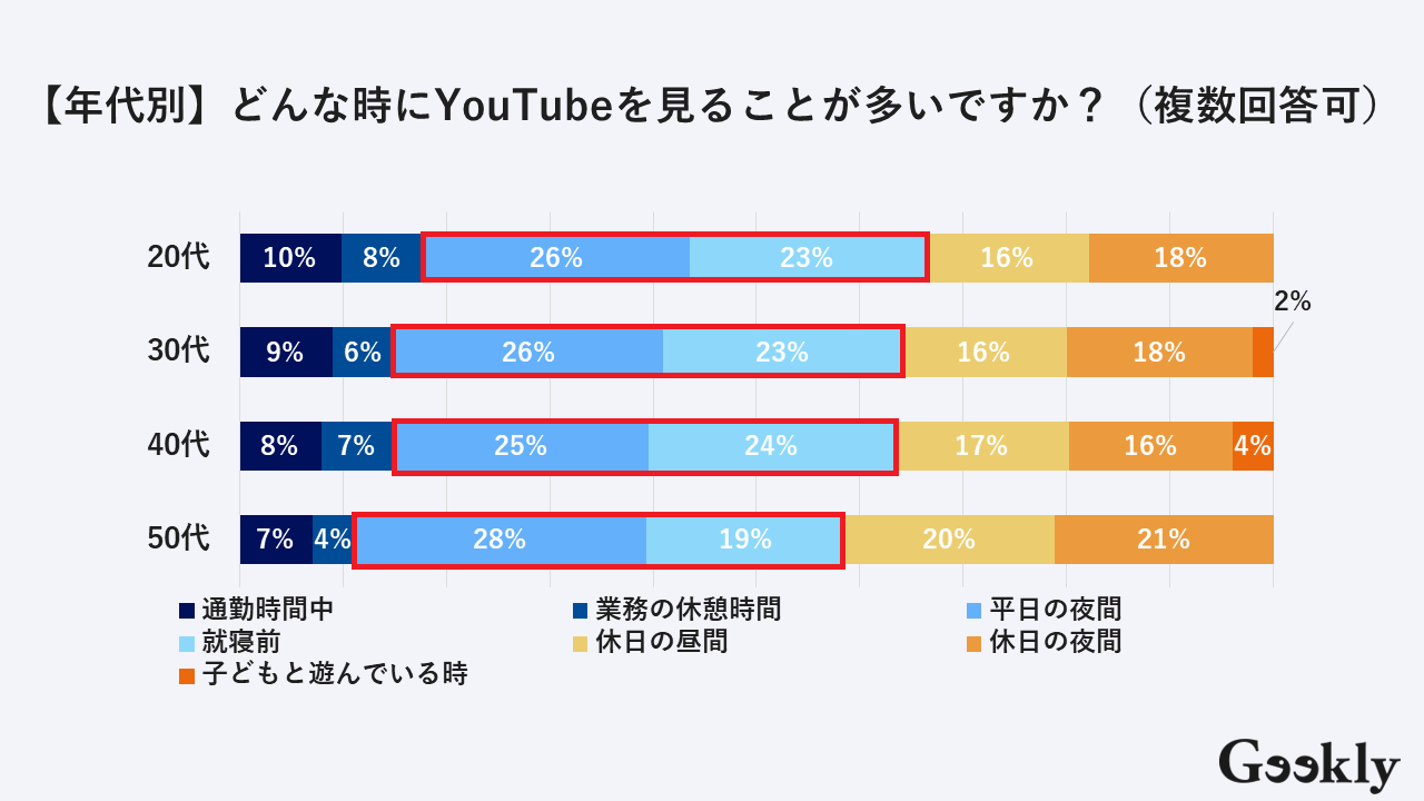 年代別でYouTubeを見るタイミングを調べてみましたが、全体結果と比較してもさほど変わらない結果となりました。どの年代においても平日の夜間や就寝前の視聴割合が高いことが明らかになっています。