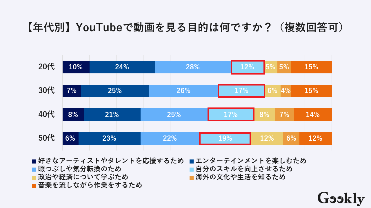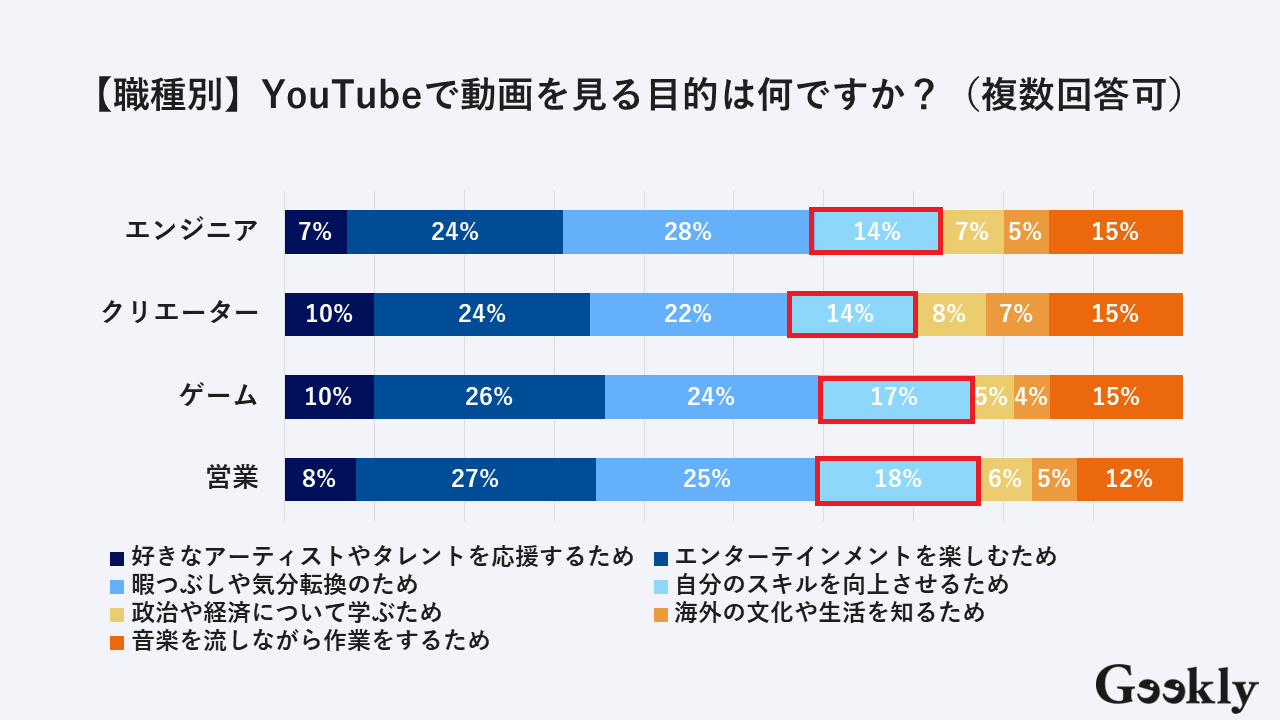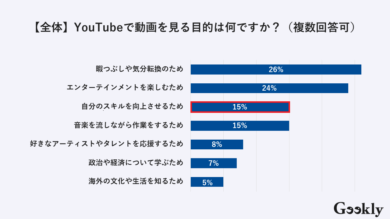 YouTubeで動画を見る目的については、暇つぶしや気分転換のためが26%、エンターテインメントを楽しむためが24%と娯楽の割合が高くなっていますが、自分のスキル向上のためにYouTubeを見ているという回答が3番目に多くなりました。