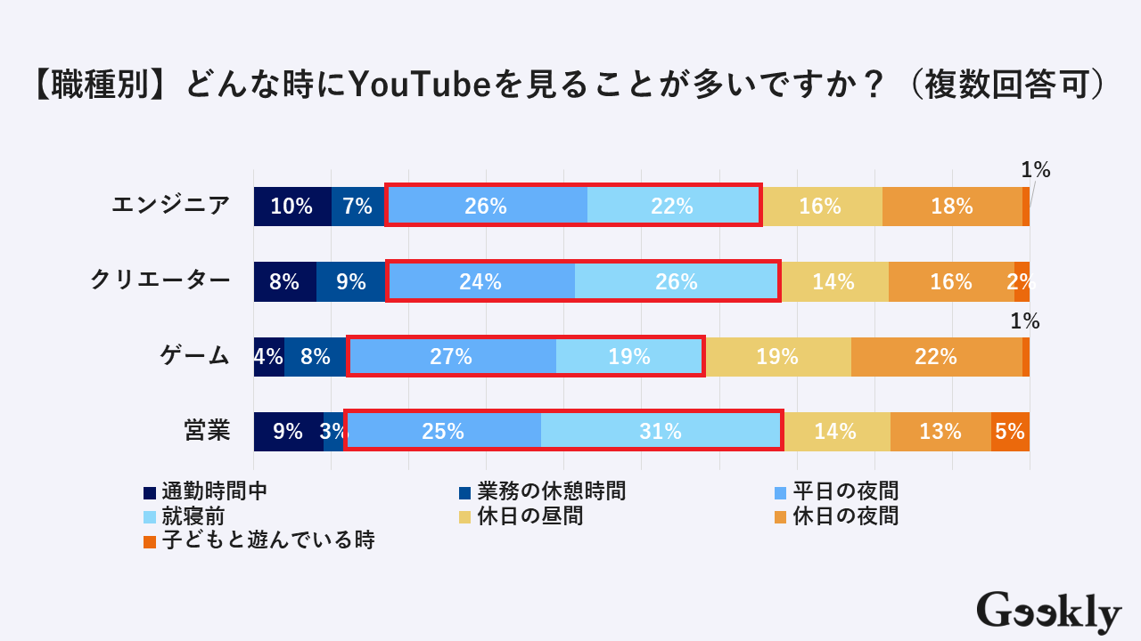職種別でYouTubeを視聴するタイミングについて見てみると、全体結果、年代別結果同様に、どの職種も夜間にYouTubeを視聴する傾向にあることが明らかになりました。職種ごとの大きな差はありませんでしたが、ゲーム職種については平日の夜間が19%となっており、他職種と比較すると低い数値となりました。