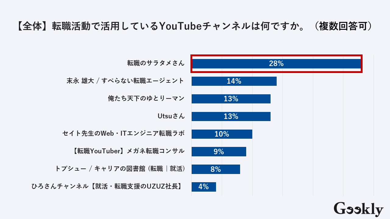 転職活動で活用しているYouTubeチャンネルの回答を見てみると、「転職のサラタメさん」と回答した方が最も多い結果になりました。