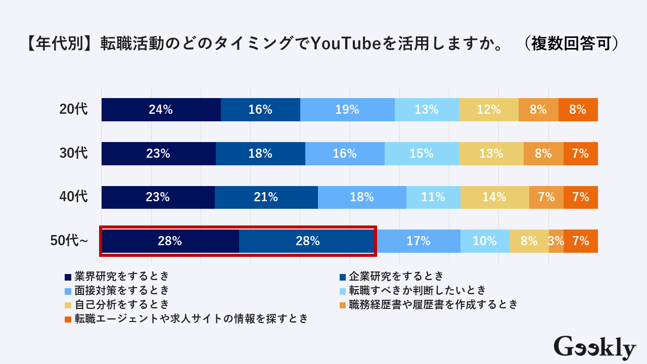 特に50代を見てみると、どの年代よりも、企業研究でYouTubeを活用している割合が高く、企業研究と同率で企業研究でも活用している結果になりました。