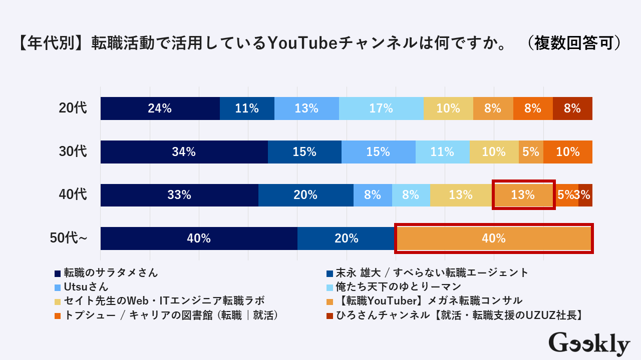 40代、50代のデータを見てみると、「転職のサラタメさん」、「すべらない転職エージェント」に次いで、「メガネ転職コンサル」のチャンネルを視聴している割合が高くなりました。