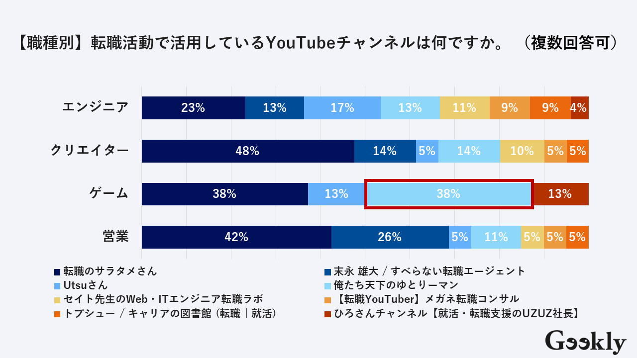 職種別で転職活動で活用しているチャンネルを見てみると、どの職種も「転職のサラタメさん」を視聴している比率が高い結果になり、特にクリエイターや営業の職種で比率が高い傾向にあります。