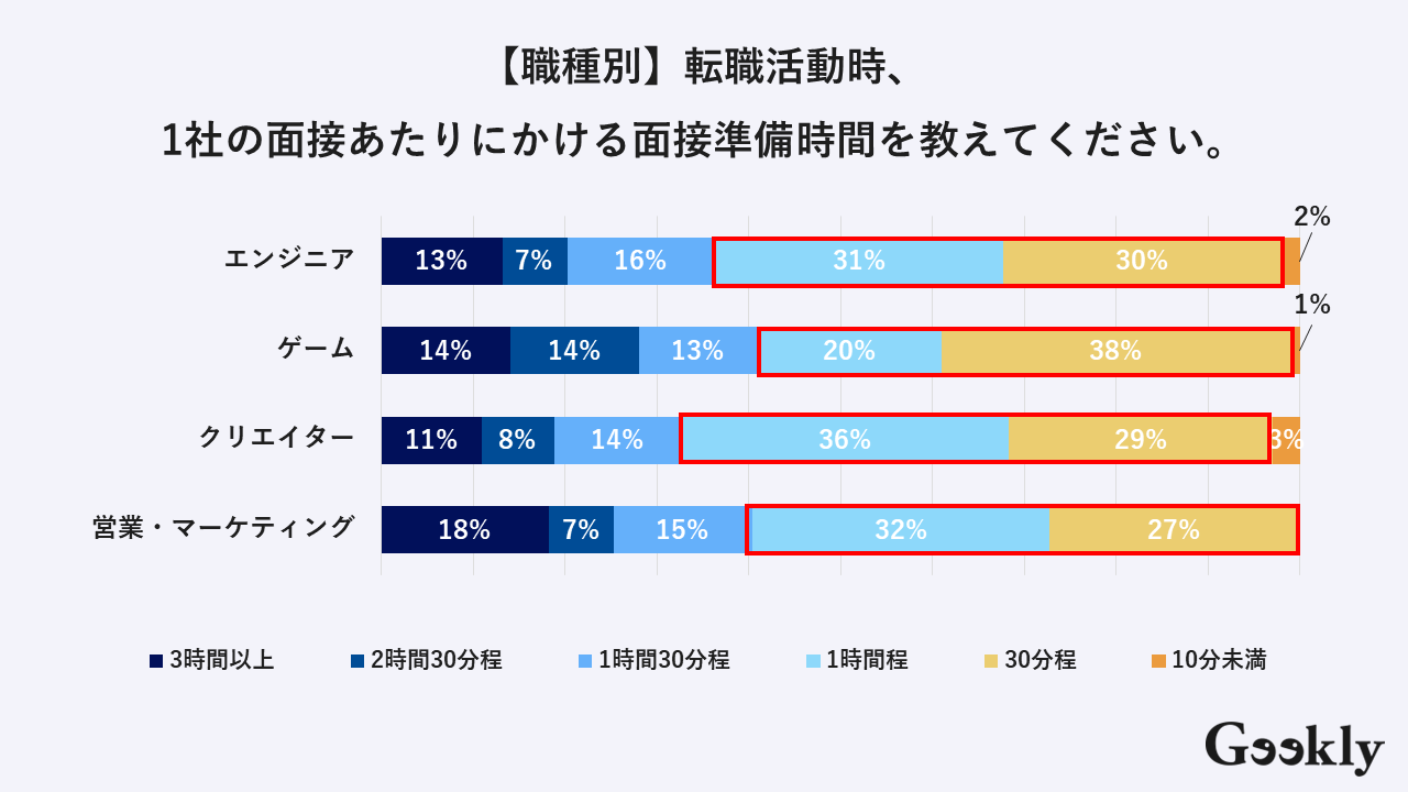 2023年6月に弊社Geekly(ギークリー)で面接準備にかけている平均時間を調査したところ、上記図のどの職種も平均30分から1時間程度かけていることが明らかになりました。