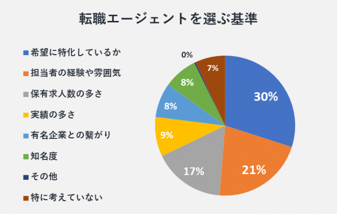 転職エージェント選びでは、自分の希望する業界や分野に強いかどうかが最優先されているようです。次担当コンサルタントのスキルや印象、求人数の多さという結果となりました。