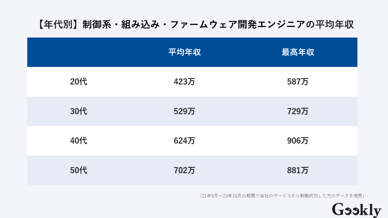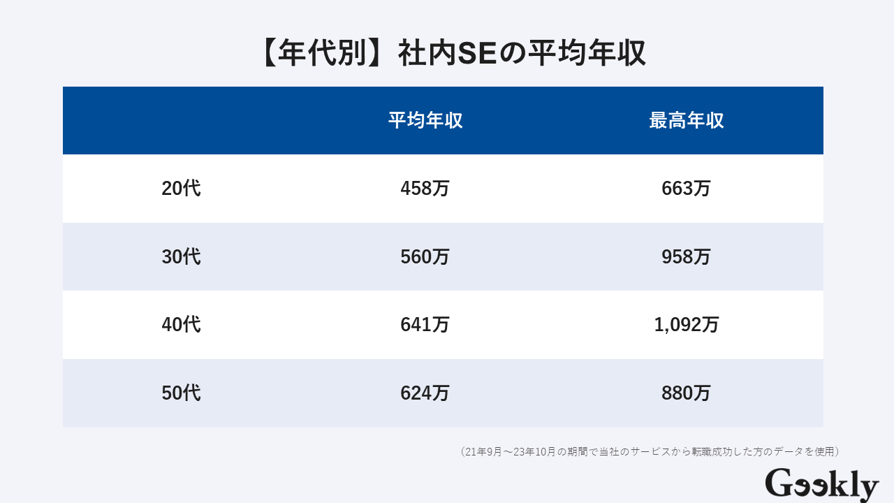 ITエンジニアの年代別の平均年収は、20代は433万円、30代は540万円、40代は675万円、50代以降は797万円という結果でした。