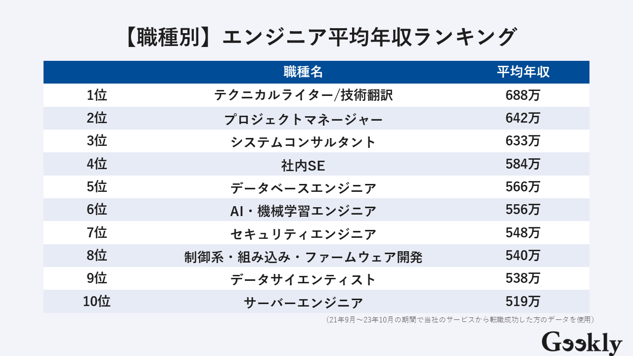 | 10位 | 組込・制御エンジニア | 552万円 |