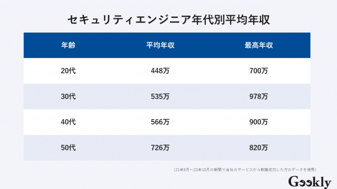 セキュリティエンジニアの平均年収は、年代別に見てもそれぞれ異なります。
