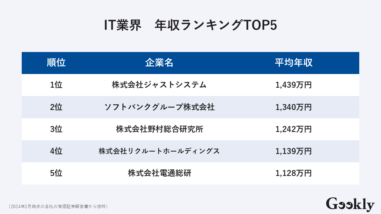 IT業界の年収ランキング1位は、株式会社ジャストシステムで1,432万円です。