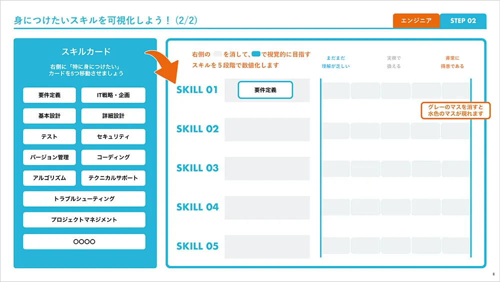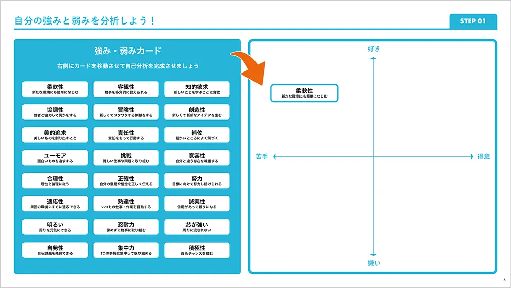 自分の強み・弱みや身に着けたいスキル、次の環境で大切にしたいことをワークシートで選択していくと、将来なりたい姿を具体的に可視化することができます。